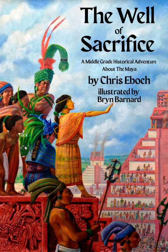 The book cover for The Well of Sacrifice: A Middle Grade Historical Adventure about the Maya by Chris Eboch, illustrated by Bryn Bernard, shows a Mayan city with tall, a pyramid temples in the background. A girl in orange woven clothing with a long black bread stands on a platform with one arm stretched out. Several people are behind her, including a tall, scowling man in a green and red headrest. Two warrior stand in the foreground.